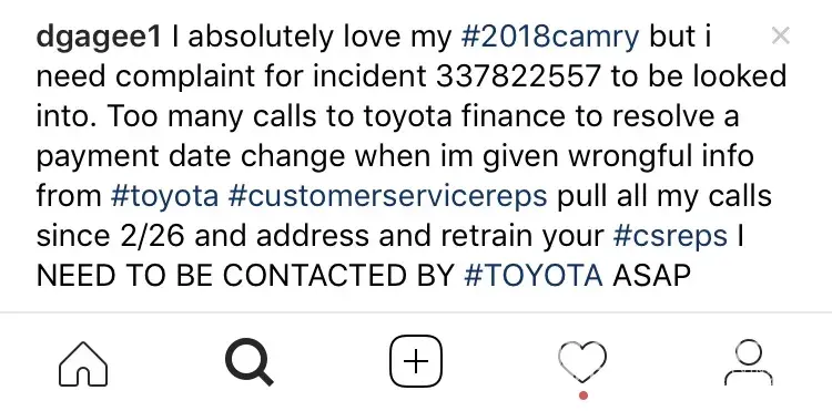 Wanting someone in the Toyota organization to get in touch with me to address my complaint.