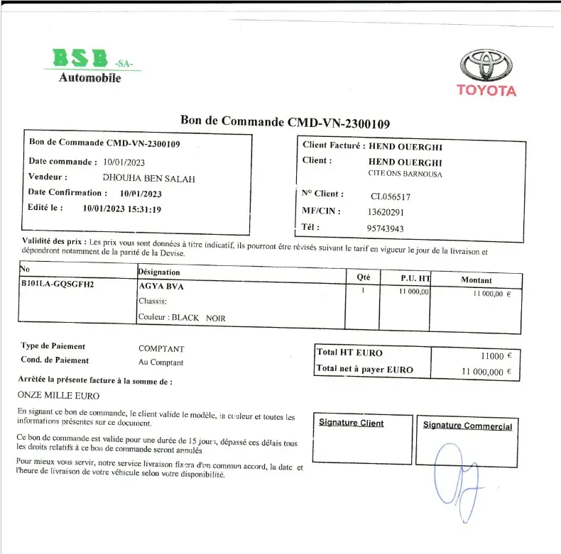 In January, my husband and I purchased a black Toyota Agya automatic transmission from Toyota La Marsa in Tunis Tunisia. We were informed that the car would be arriving at the nearest port weeks later and that we would be able to pick it up sometime in late February.