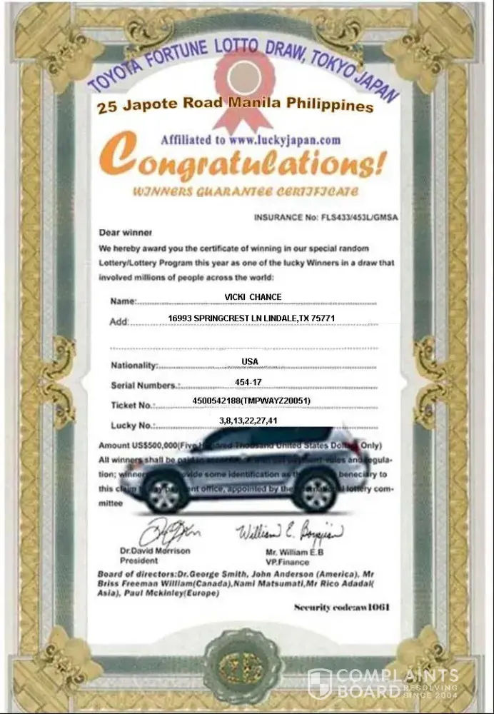 yes, i received an email a few weeks ago claiming i won $500, 000.00 USA + a 2010 Toyota just for having the right email address...i hadn't entered any lottery but i won...out of several people i was a winner..All I had to do was send my Name, age, and which port I would like my car, along w/ my e-mail address and sex. Seemed easy enough...no harm, right...wasn't being asked my D.O.B or address or even bank account info. so I sent in Then came the actual certificate w/ my winning info stating I won the $5oo, ooo.ooUSA and 2010 Toyota wanting to know my bank ing information and a copy of my passport id and photo, along with my address and everything else...telling me the bank was in the phillipines and that once they received my info they would contact me... I sent an email stating I had no bank account and No passport so what would I need to do. I haven't Heard a word since...I wasn't born yesterday..Maybe blonde, but I'm not ignorant...well, here's all the INFO on these guys: maybe you can catch them or something...HERE'S to all the BLONDES who get picked on...T.T. section Bank of Commerce, phillipines, Attention: Mr. Charito Bayani, [protected]@commercebk.net or www.commercebank.com