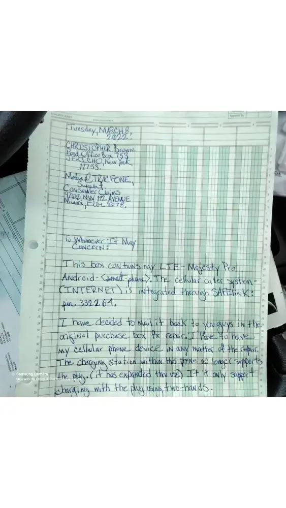 Zte - majesty pro; android - smartphone: mailed back, tuesday, march 8, 2022; u.S. Of a. Postal service - jefferson road, rochester, new york 14623 (main branch provider). Charging port expanded (thru use): no longer supports plug; two - hands required to support charging port for recycle. Valid/current service carrier: safelink - pin: 332264. Sent to: 9700 nw 112 avenue, miami, flor. 33178. (legal department, support, and consumer claims) this particular phone is geared for office - work. (office - mate/compatibility) original purchase box: mail return/to sender. Serial/manufacturer numbers included in box.
