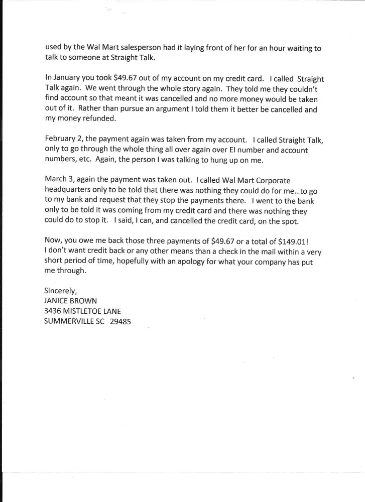 TracFone's company, Straight Talk refuses to talk to me or answer my letter regarding problems I am having with their service. I purchased a phone a Wal Mart. They talked me into purchasing the Straight Talk service. I asked that they transfer my existing phone number to the new phone. The sales clerk attempted unsuccessfully to do it. I finally told her I would take it home and try to do it myself, also unsuccessfully. I took phone and Straight Talk box back into Wal Mart. As per attached letter, it still was not accomplished. I took the phone back to Customer Service and turned it back in, requested my refund for the phone and the program. I was refunded for the phone but was told I would have to get my money on Straight Talk back from them. THe attached letter explains all of my attempts to do so. In the meantime, they kept taking money from my account, for months, for a program I never used. Please help me get my $150 back that they took out of my checking account. Janice Brown