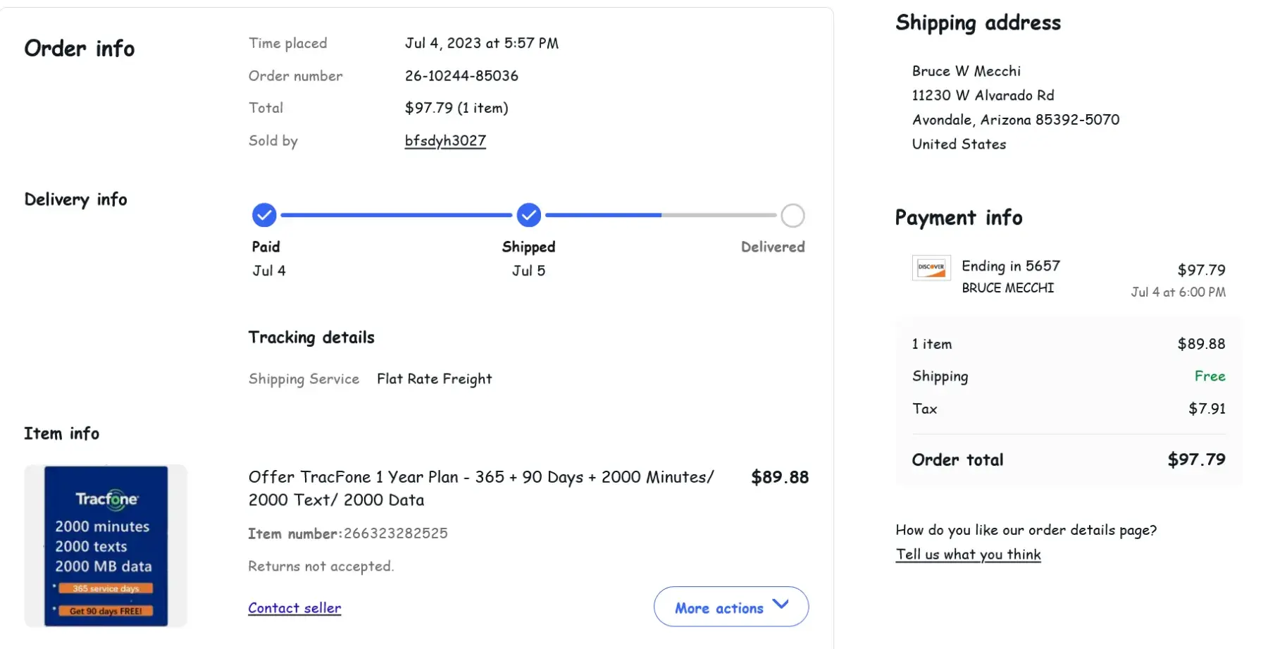 On July 4, 2023, I purchased a one-year Tracfone Card on ebay, as I have done many times. The card topped off my existing balances to 9.56 GB of Data, 4700 Minutes of Phone, and 2678 Texts, with a Service End Date of 10-3-24.