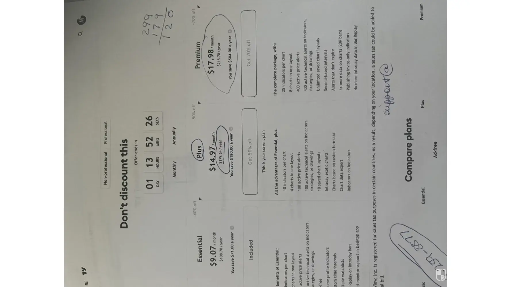 [protected]: Signed up today fro PRO+ then after tinkering around I tried taking advantage of the BlackFriday discount for the Premium price and suddenly the charge has increased by 39% in a matter of hours. The original offer is on the webpage but the TradingView.app Apple price is raised. Who is the digital price manipulation thief here? Apple or TV? Obviously, this 'review' isn't about the charting merits of the TV app, it is about the digital scams US citizens are subjected to on constant basis. If forced to guess which is the biggest or most likely scammer here, then I'd have to go with the platform monopolist with a proven track record of fleecing customers for the benefit of their majority shareholders. I couldn't care less what sort of response this 'review' spurs other than honoring the BlackFriday offer posted when I pressed the 'upgrade' button on the webpage. As for the app switcharoo price take that and ... I have the screenshots of the posted offers with all the consumer has to go by practically speaking so please don't waste your time point fingers or spewing corporate droidisms.