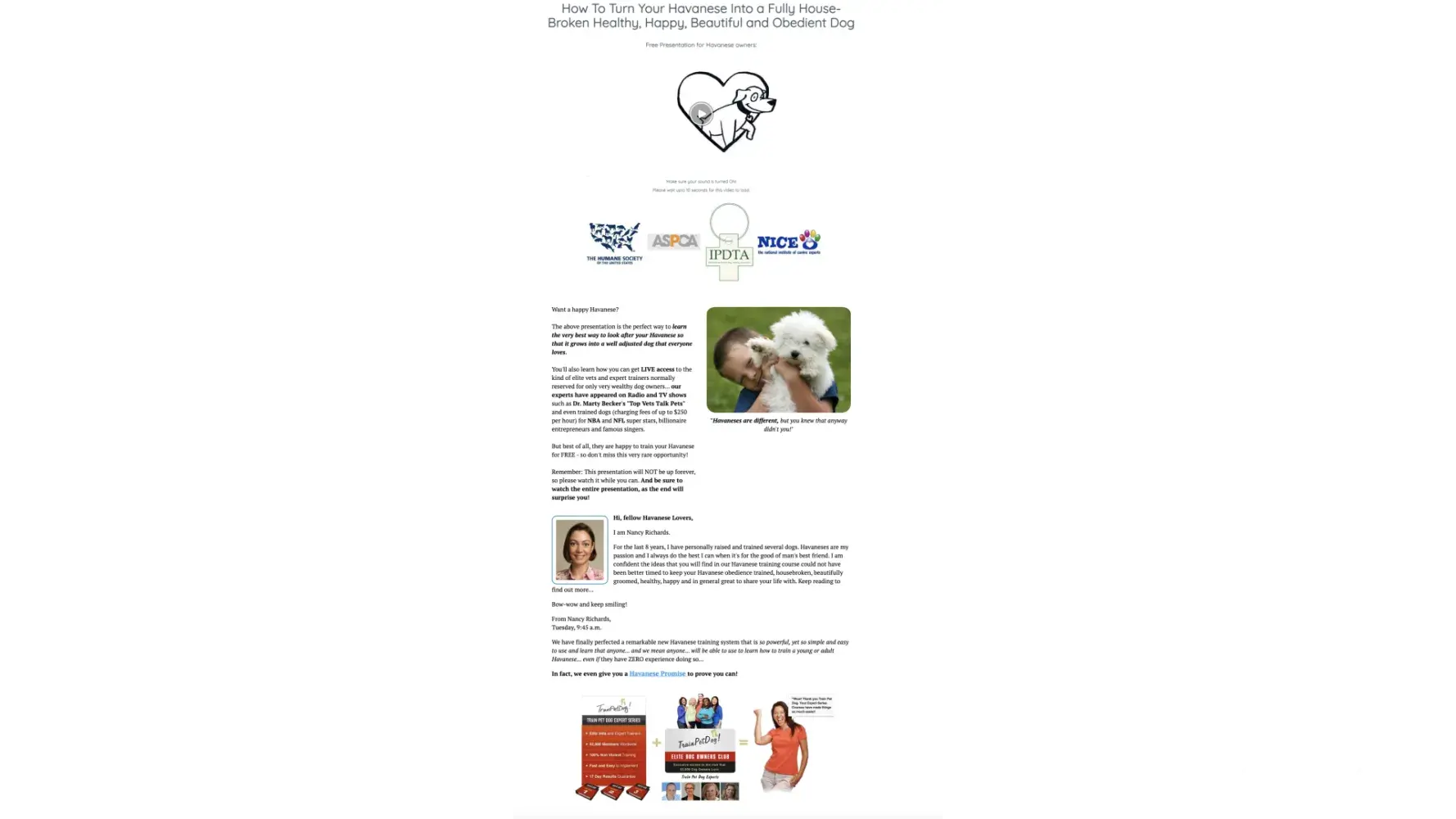 I, a to-be Havanese owner, researched this video and found it informative and even screen-recorded it on my computer since the video repeated that "this presentation will not be up for long!" ...That was probably yet another tactic to get people to spend their money on this dog training course.