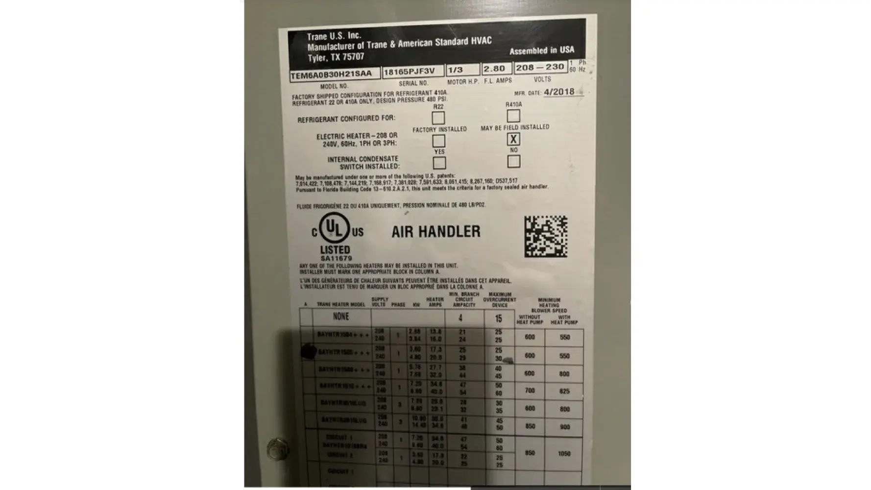 I forgot to add the air handler model number TEM6A0B30H2ISRA (tried to read techs handwriting).