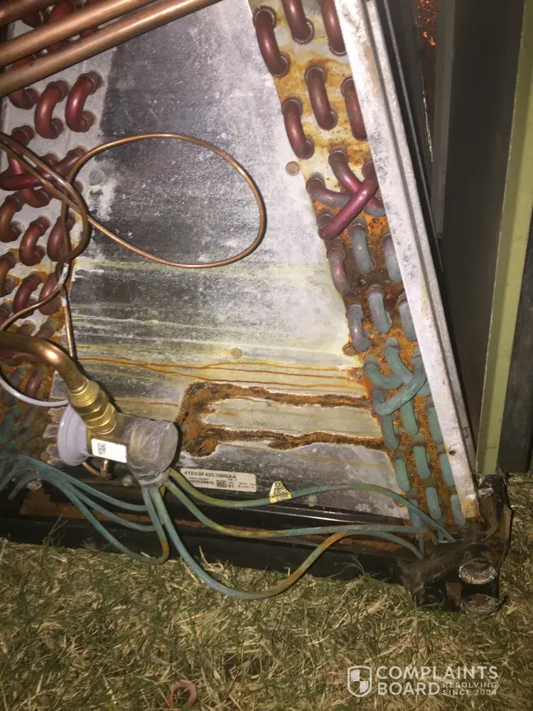 have attached a photo of a eight year old unit(coil) installed new in my home. I was having to add refrigerant every year after year four. I had service techs out to look at unit and ran testing for leaks. Notice in the photo that when coil was put into blower housing unit it was pressed against the sheet metal. This in time caused electrolysis causing the unit to have a small leak. I have replace my old Trane with a new complete unit under protest. Please tell me what Trane is going to do about this problem? The quality assurance standard was NOT and should have NOT been passed.