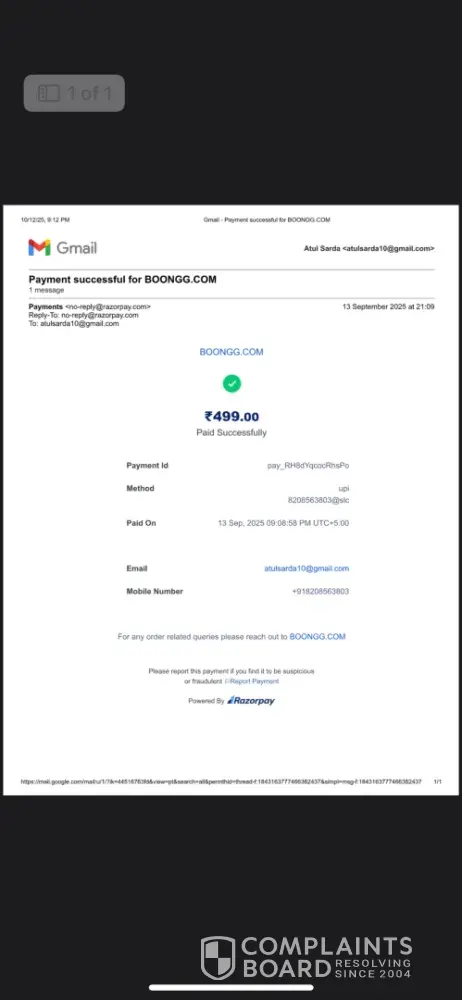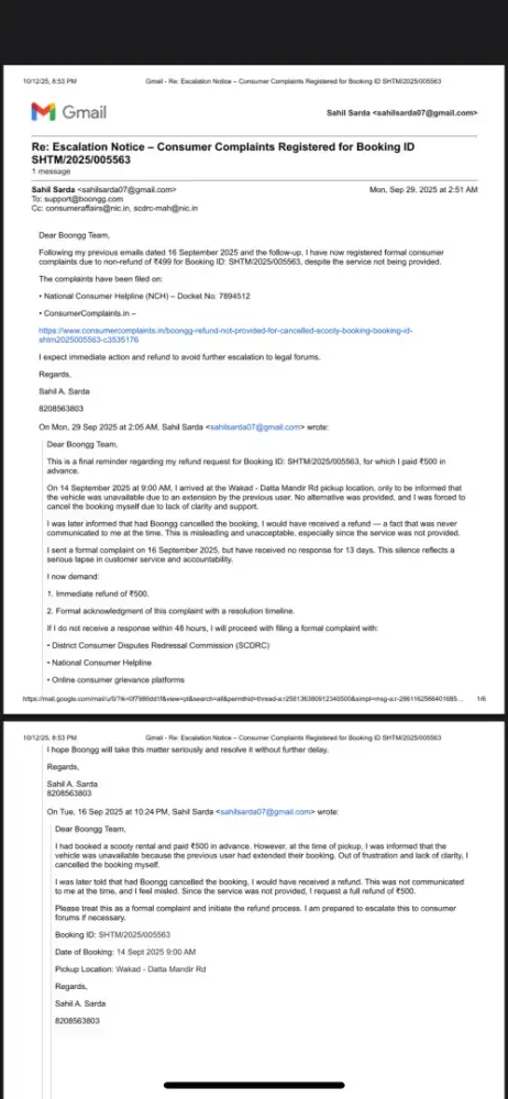 BOOKING DETAILS: Company: Boongg Scooters Pvt Ltd (www.boongg.com) Booking ID: SHTM/2025/005563 Transaction Date: September 14, 2025 Amount Paid: INR 499 (approximately USD 6) Service: Motorcycle/Scooter rental in Pune, India WHAT HAPPENED: Booked scooter rental with advance payment of INR 499. While traveling to pickup location at their Wakad office, I...