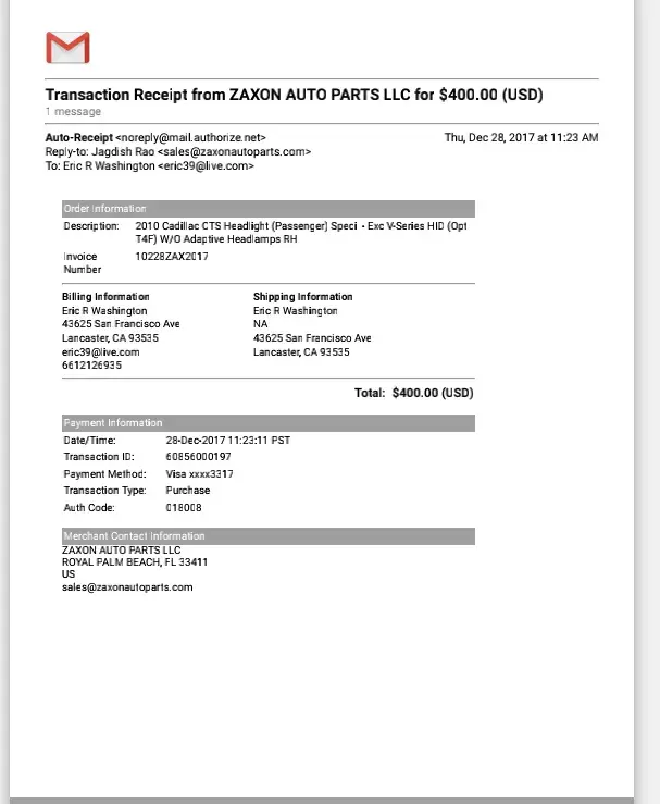 On 122817 I ordered a passenger side headlight for my 2010 Cadillac Cts from Zaxon auto parts for $400. on 1218 I received a headlight that did not match the one i wanted. I called Zaxon auto parts [protected]) on 1318 an explained the problem an was informed that it would be taken care of an someone would be contacting me. After not recieving a call...
