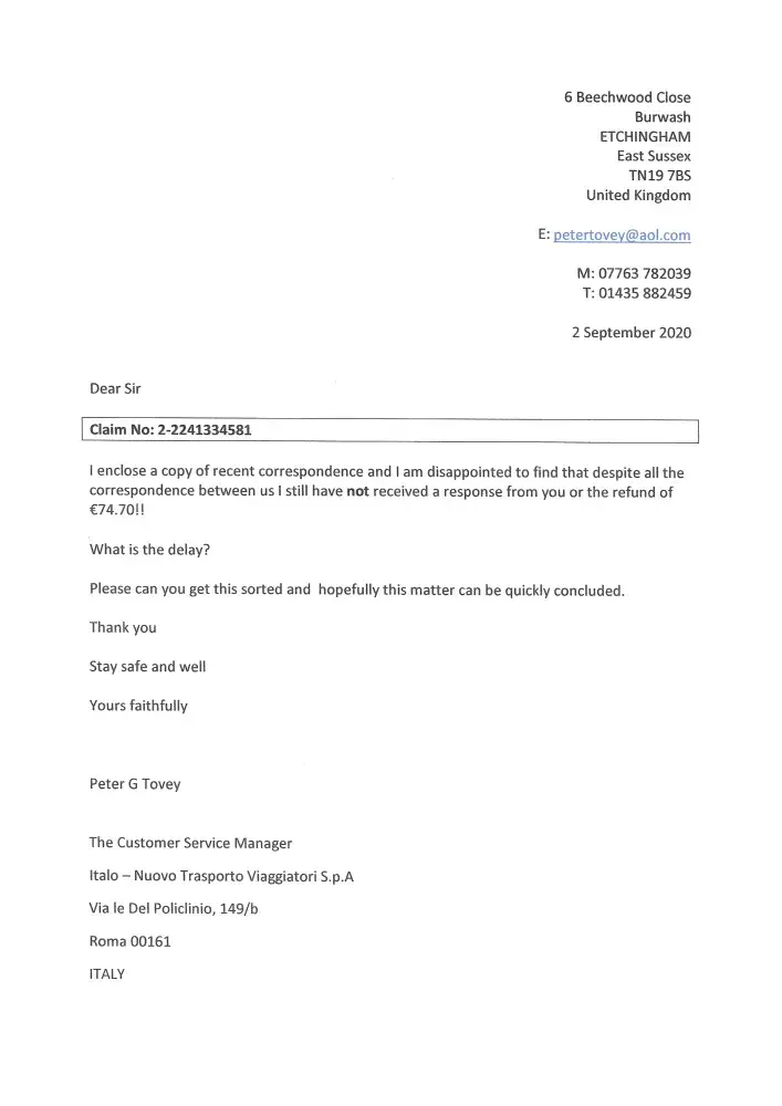 1. Trip to Bologna in March 2020 cancelled due to Covid-19 2. Applied for a refund of €74.70 in respect of 3 tickets to travel from Bologna to Florence on train 8953 (Ticket no: E52KPY) 3. Claim allocated case number 2-[protected] 4. Despite several email chasers and letters including one sent "Signed for delivery" still no reply or refund 5. Claim i...