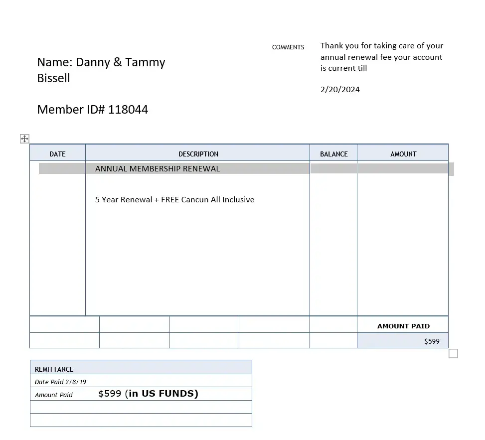 Desired outcome: My FREE Cancun All Inclusive trip and my contract as it states on my receipt. renewal date of Feb 20, 2024