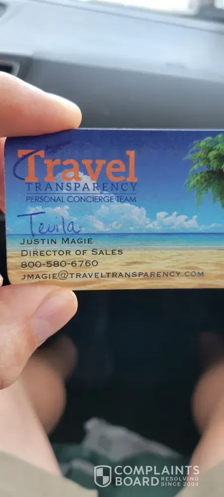 Travel Transparency is a joke! The joke is on you. And you will pay the price. The punchline is there is nothing transparent about this company or its website! If you love feeling of being cheeted and taken advantage of this is the company for you. For me, this was a horible experience and a complete waste of time. Beleive the reviews. You will get nothing that was promised to you on the phone. We were promised free RT airfare. It's free if you don't count a $50 registration fee and taxes. It cost $400 to make a reservation that is not guaranteed. We were promised a $100 gift card that we never received. Instead, you get a Groupon type deal that also requires a registration $25 fee, and you can get 1 $25 credit off the cost of your meal once a month at a participating restaurant. This "free dinner" certificate is worse than groupon. It has more restrictions and more work involved. You have to redeem your $25 restricted credit every month or you loose it. This sorry excuse of a business can't even give you a free gift as promised. Justin magie you should be ashamed of yourself. Imagine if your mom in Florida was taken advantage of the way you are conning people, especially the elderly on fixed incomes. Or was that a lie too? I hope this review inspires people run as fast and as far as they can from you and your company. I have included Justin's business card. Notice his 800 number as a contact. Feel free to reach out to ask if any of this is untrue.