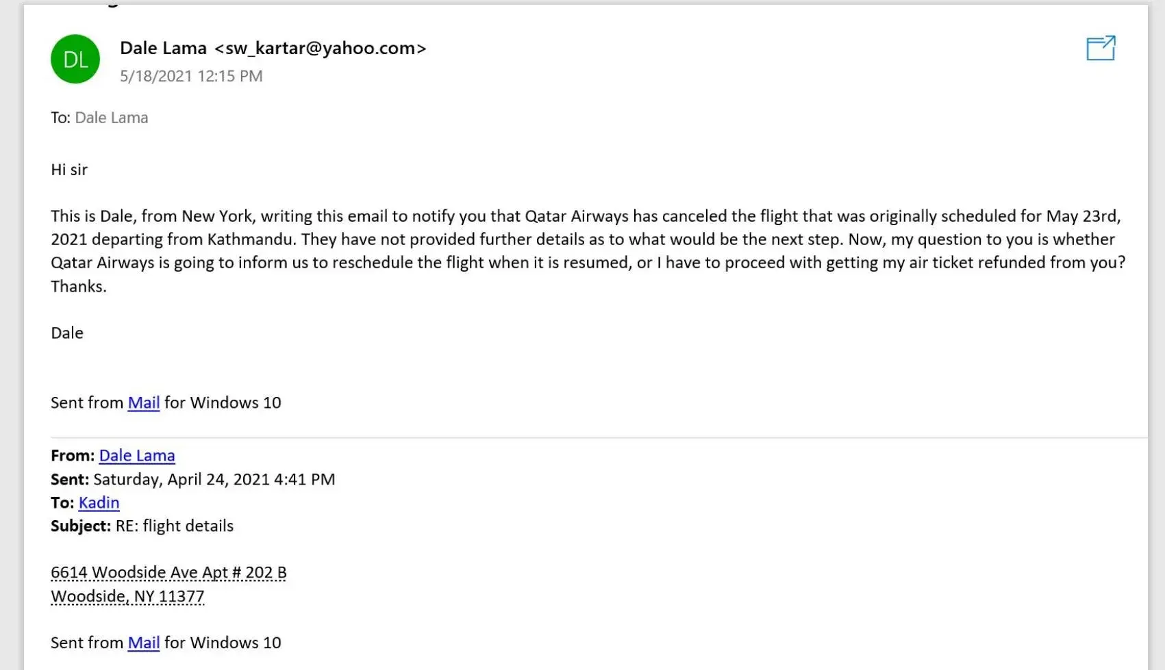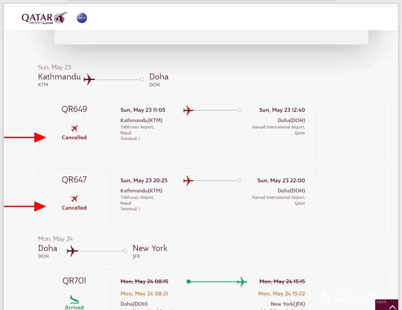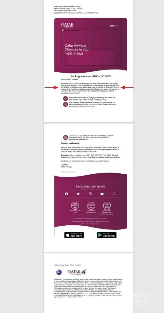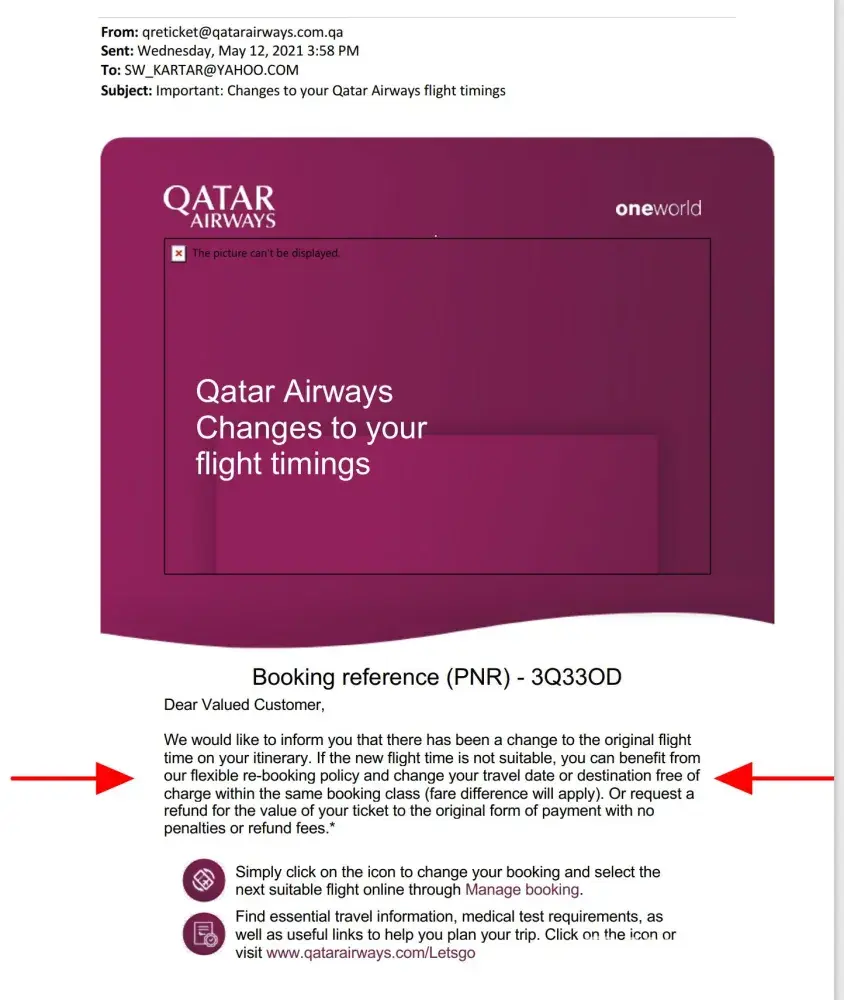 A couple of days later, I received an email from Qatar Airways saying the flight that was scheduled for May 23rd has been canceled, and I get to pick a different convenient date at no extra cost, but since my ticket was purchased from TravelerHelpdesk I have to contact them directly.
