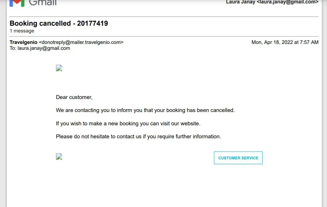 I received an email that there could possibly be a duplicate booking here and to advise them immediately whether to proceed with a refund or to still issue the tickets. I wrote back 2 minutes later saying to confirm the ticket. This was already 6 hours before my scheduled departure. Without ever trying to reach me by telephone or ever responding to my email travelgenio has cancelled my reservation (as I learned from the airline)… I have now been on hold for 2 hours attempting to speak to a representative in the hopes that this can still be resolved after they cancelled my ticket without my permission.