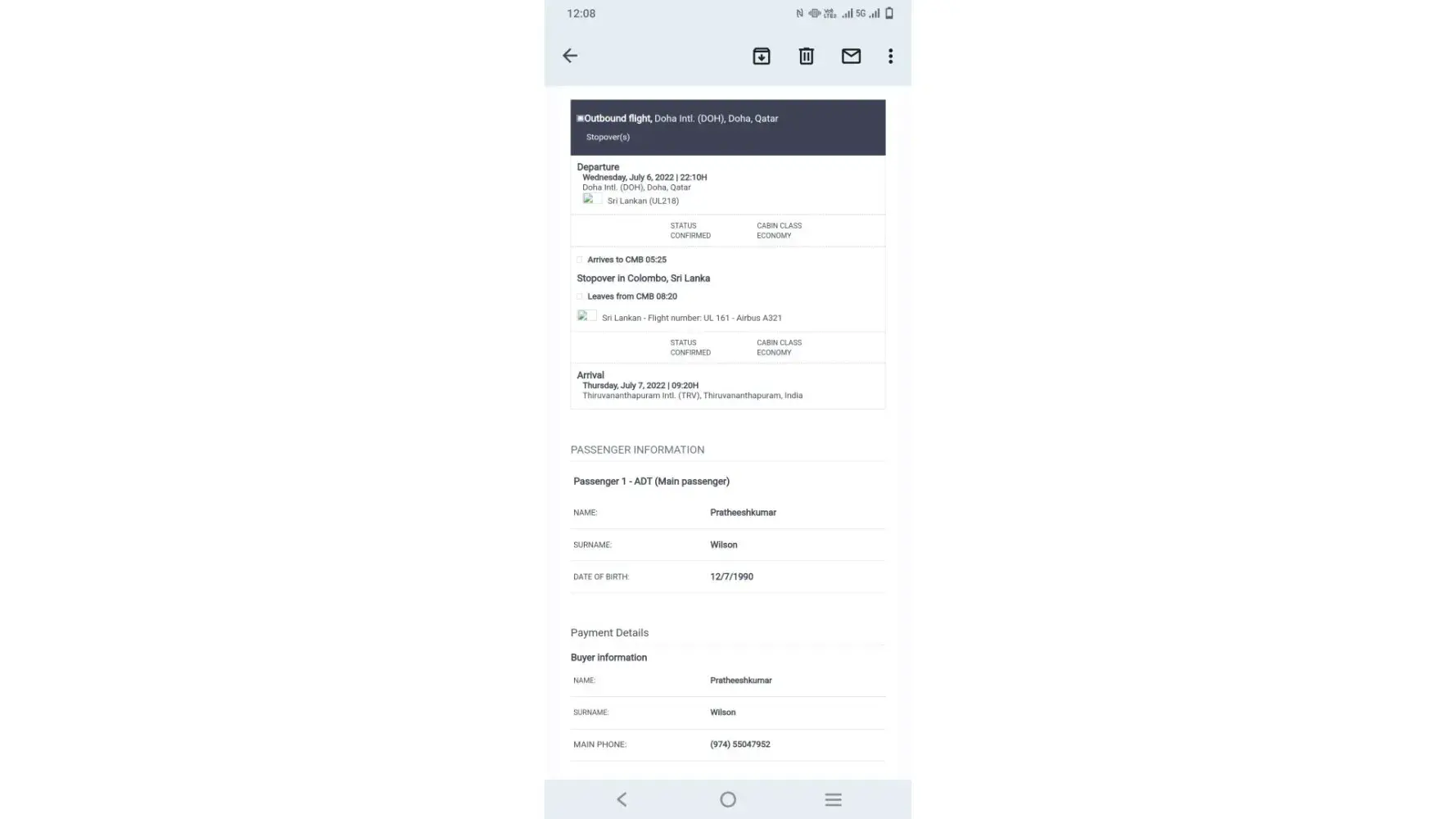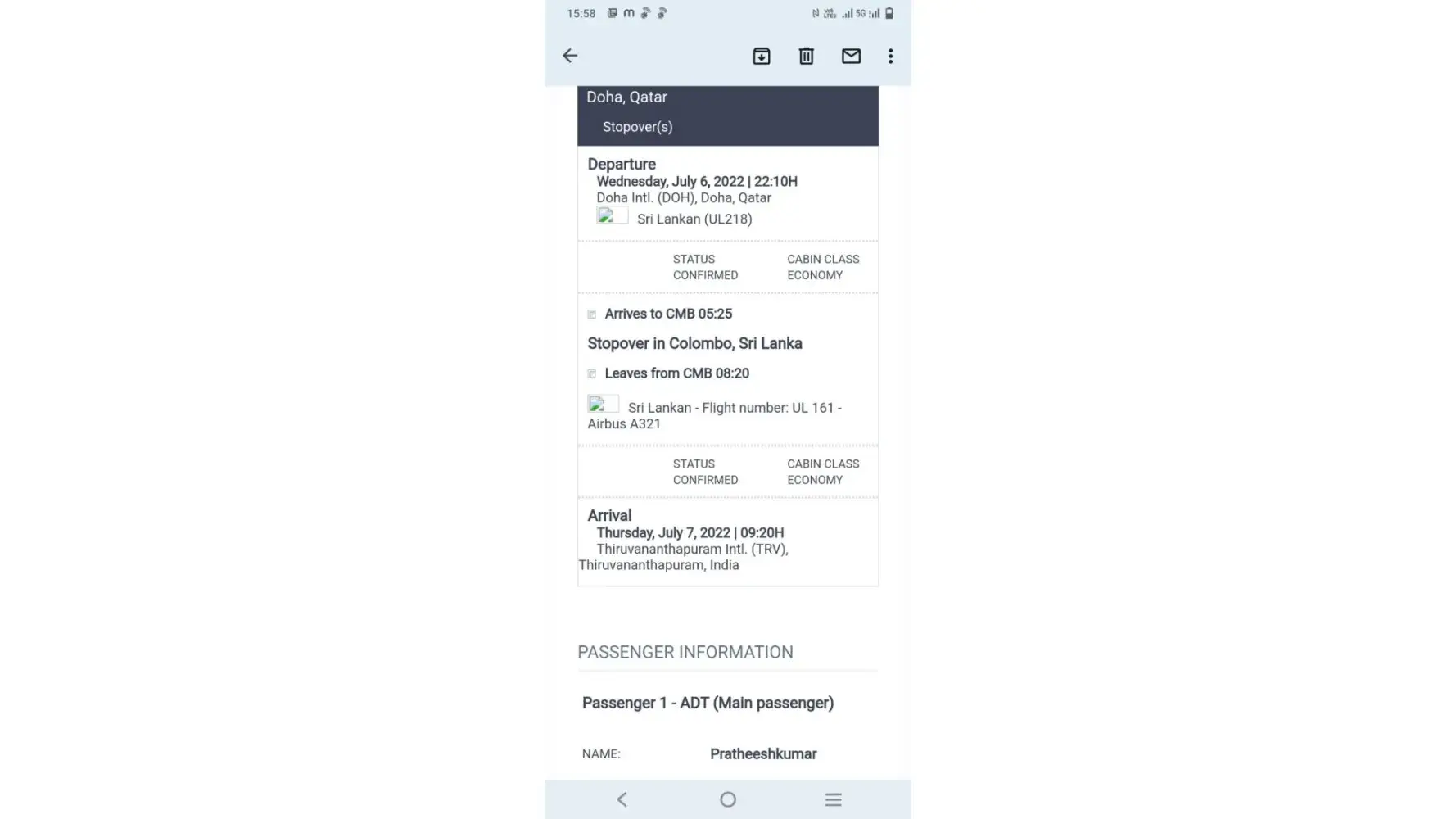 kindly note that yesterday date 05th june2022 I booked a ticket travel ginio Doha-Trivandrum booking ID: [protected].