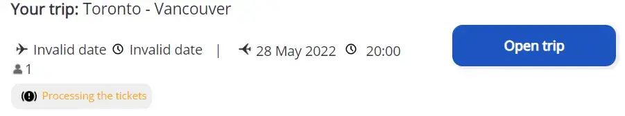 I've purchased a round trip ticket from Toronto to British Colombia from Monday. May 23rd to Saturday, May 28th. I can see my return flight on May 28th on the portal, but it shows "invalid date" for the departure flight and I do not see the tickets within the portal. I purchased the tickets on March 22nd and received the confirmation email for the trip on March 23rd, but the links within the email do not work anymore either.