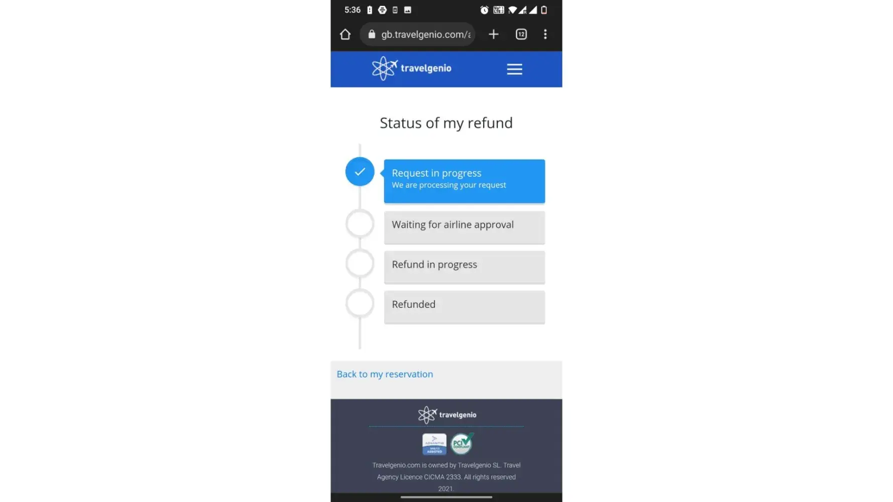 Travelgenio booking portal - no status on refund