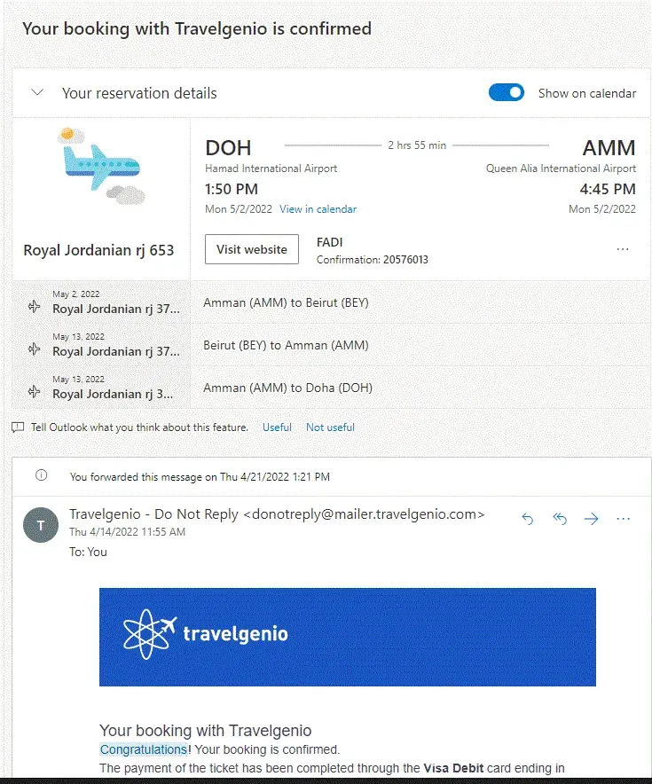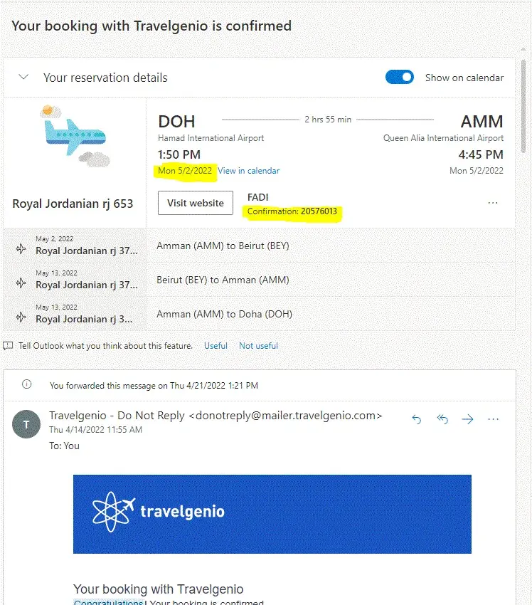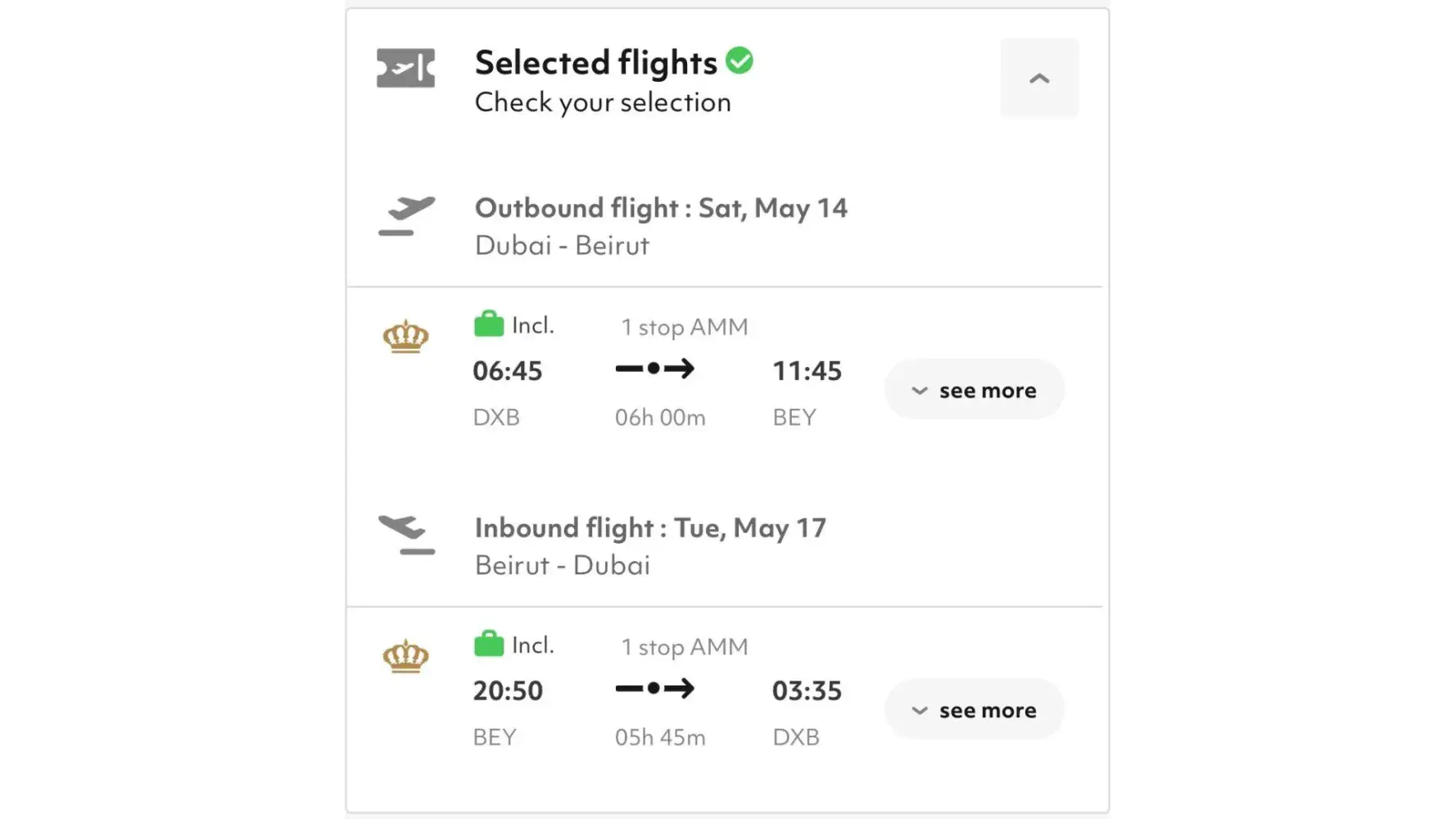 I booked a round trip ticket today on Kayak.com and Travelgenio from Dubai, UAE (14 May 2022) to Beirut, Lebanon and back to Dubai, UAE (17 May 2022).