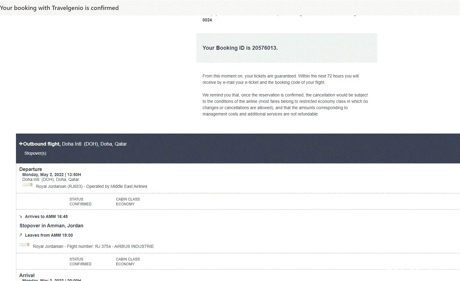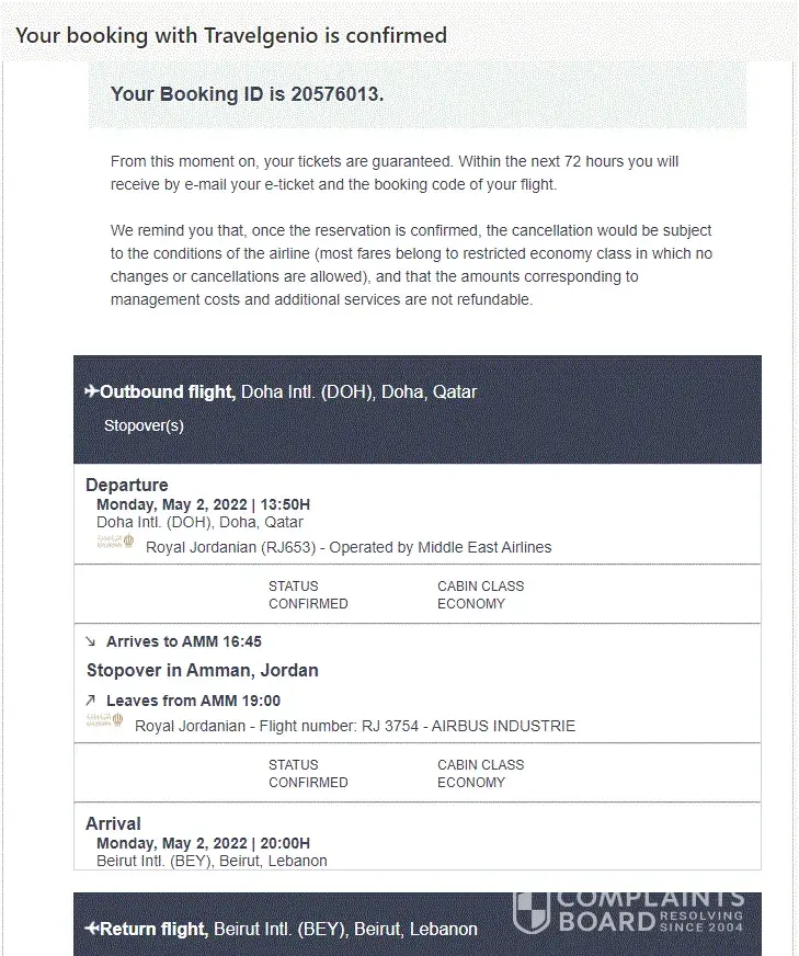 kindly note that since 14 april I booked a ticket true travelginio dated 2nd MAY Doha-jordan-jordan-beirut booking ID: [protected] after many complain I received a mail from travelginio informing if I wish to change the date I have to pay extra 100 euro or they can process refund I didnt ask for refund kindly send for me the ticket dated 2nd may 2022 to my mail asap