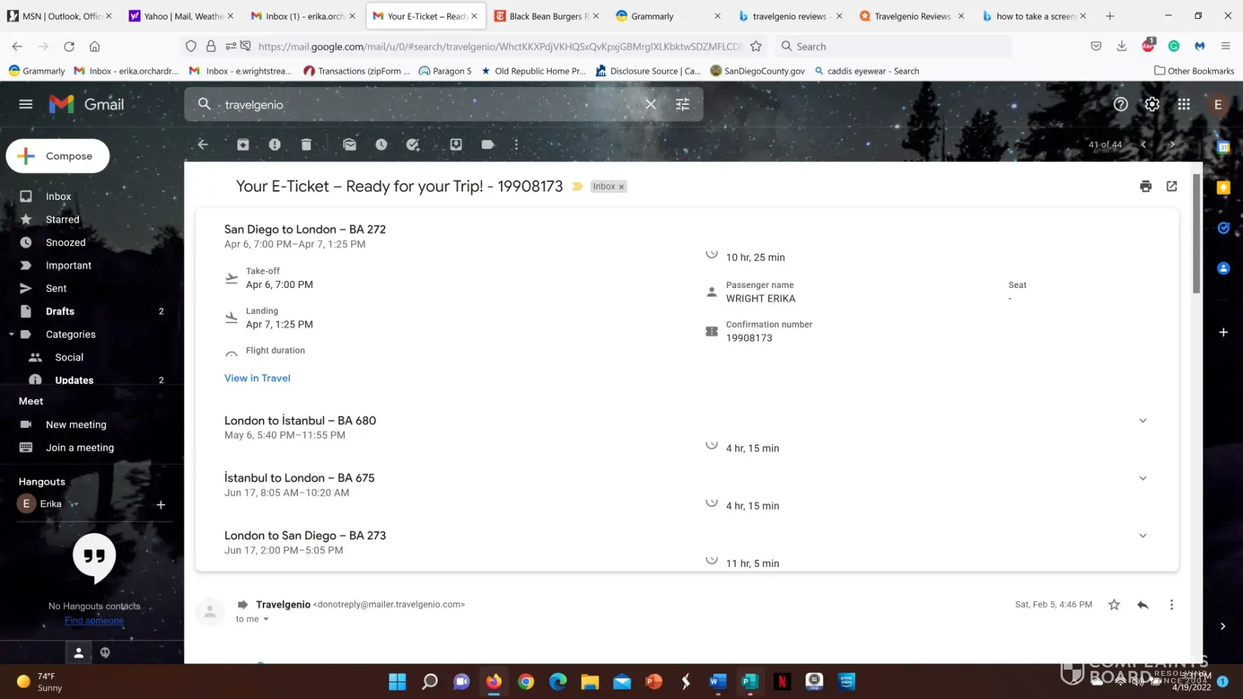 I've attached a few links to websites that rate online travel agencies. You'll note that Travelgenio has consistently terrible customer service reviews, not unlike my own. I’ve also attached a screenshot of the email they sent me reflecting the incorrect dates.