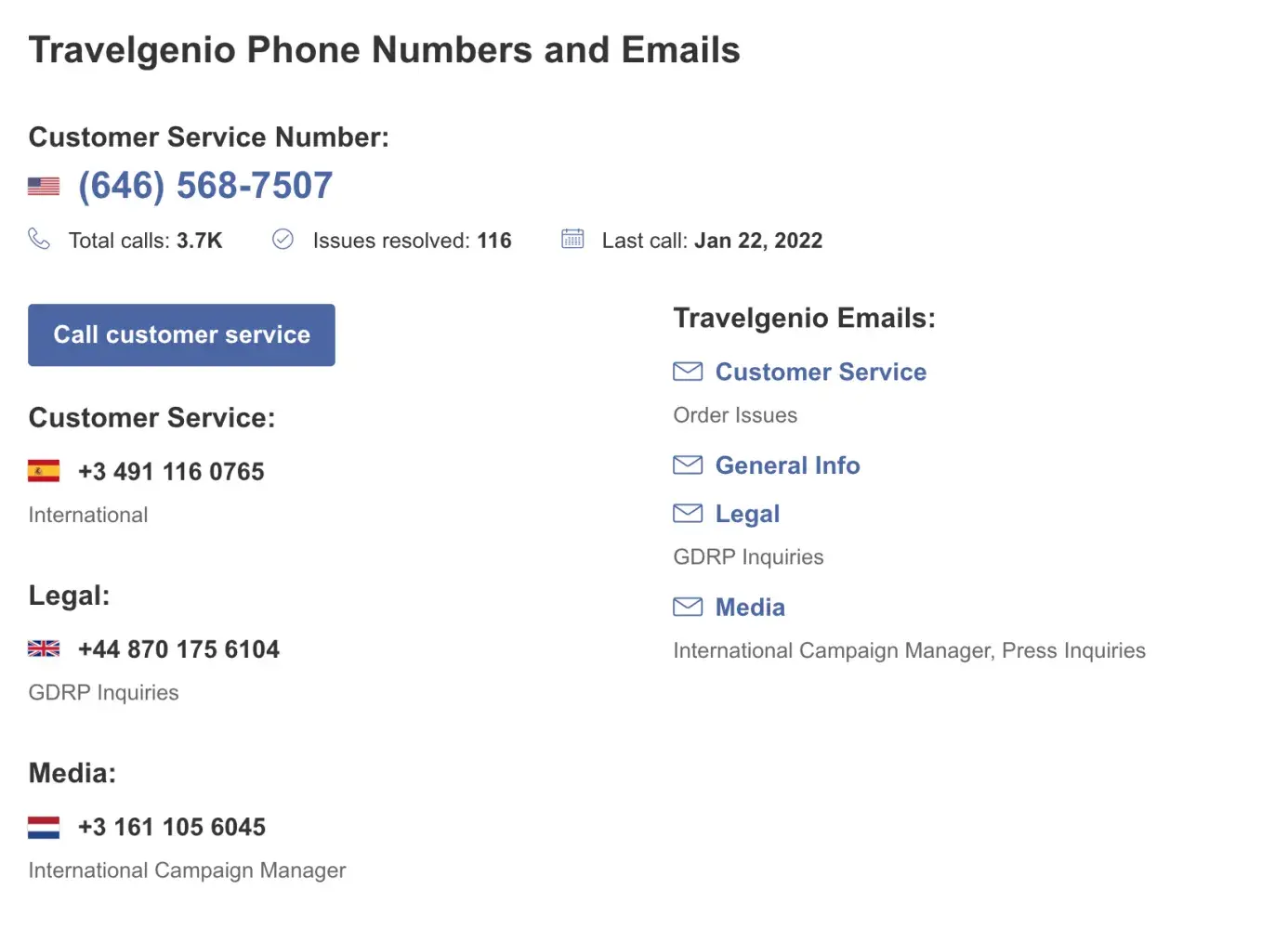 I did manage to find a phone number for TravelGenio, but the hold lasted more than 40 minutes and ended with a survey asking me how my call went - there was no service.