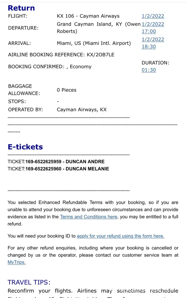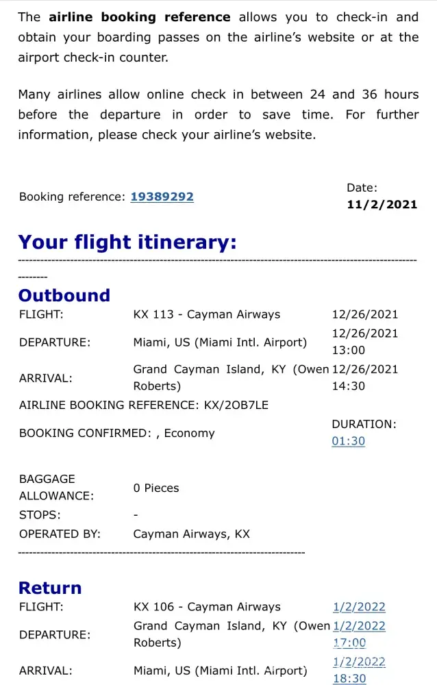 The night before travel, 25 December 2021, I attempted an online check-in for the outbound flight using the record locator code and the e-ticket numbers provided by Travelgenio with Cayman Airways and was not able to check-in with either method. The results were a "Not valid" error message in each case/attempt. I have to purchase two tickets for the same flights DIRECTLY from Cayman Airways at a total cost of US$1, 950.30!