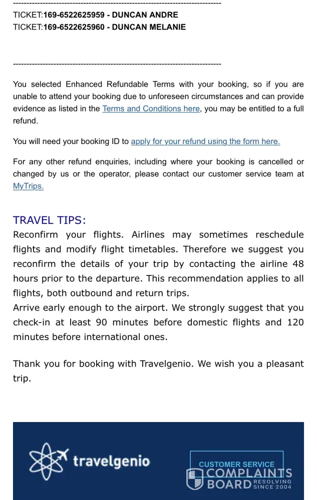 I had a flight booked with Travelgenio reference KA8H22 and ticket number 071-[protected]. The flight was cancelled and a refund was in order. Later on I was told they couldn't do a refund for me and I had to contact the airline directly. I contacted the airline directly and they advised they'll give me an open air ticket to use anytime within one year.