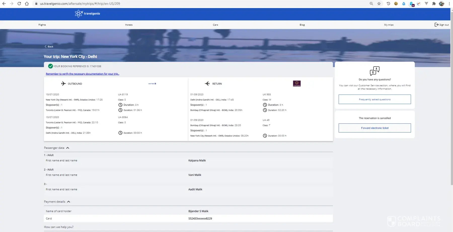 Hello there, I booked flight thru site https://us.travelgenio.com/ - the details are as below and also attached is the copy of the flight. Flight booking reference number: XDCXKO Flight booking code: [protected] The flight was cancelled by United airline and the airlines refunded the full amount back to travelgenio. But travelgenio is not refunding my amount. Can you please help me to get my amount back from travelgenio? Thanks, Kalpana Malik +[protected]