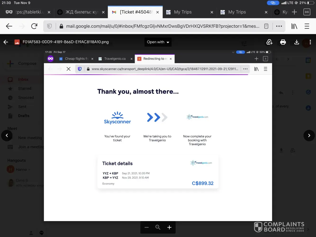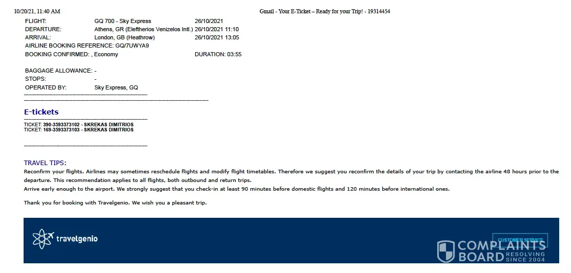 I purchased a ticket on the website Travel2be (aka Travelgenio): booking number [protected]. My account was registered under the email [protected]@naver.com. The company sent me the e-ticket to this email address on 8 October 2021 (see attached screen shot).