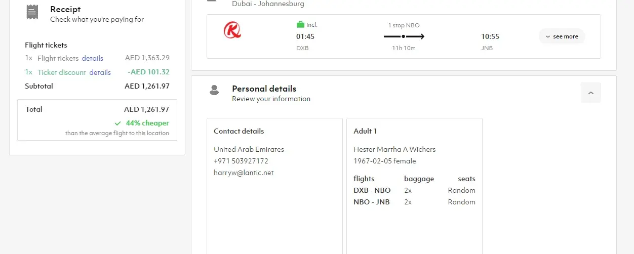 I bought a flight ticket from Dubai (UAE) to Johannesburg (RSA) on 4 November 2021, travelling with Kenya Airlines via Nairobi (Jomo Kenyatta Airport) from Dubai to Johannesburg.