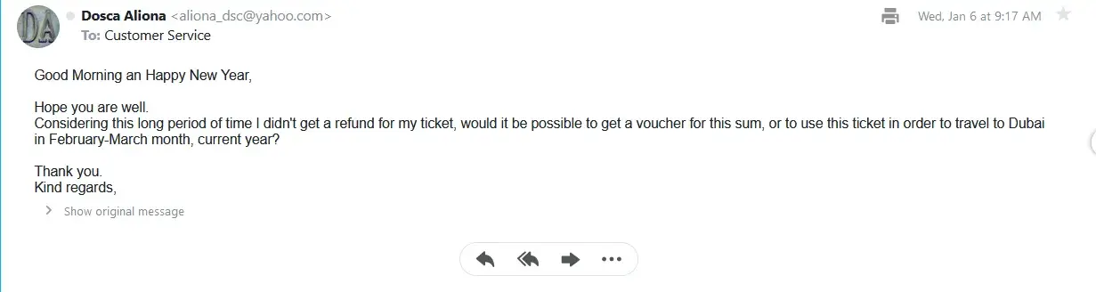 After waiting a long period, on 06th January 2021, I decided to ask if they could change this ticket into a voucher, as I still didn't received my money back.