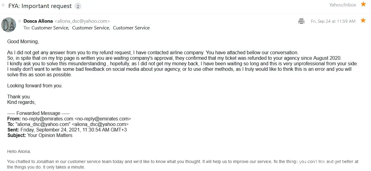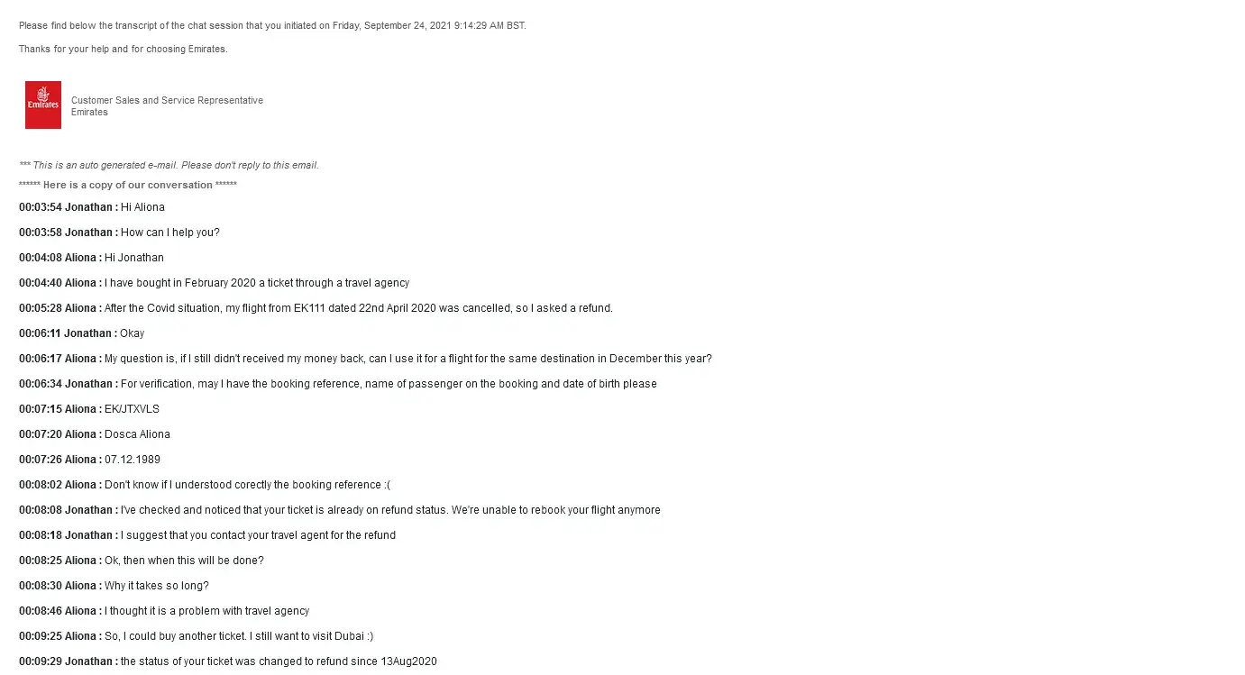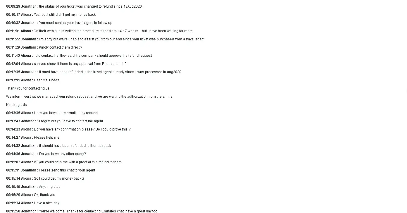 24th September 2021 - Decided to write to airline company directly. Their answer: They have managed my request and approved my refund since August 2020, and that I should talk to my agency to get my money back, as this should happen long time ago.