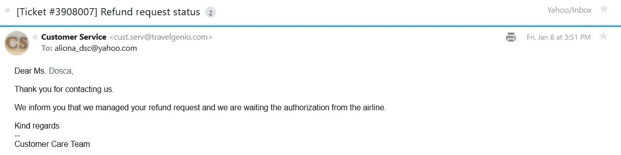 I contacted the airline by myself and they informed that the ticket is refundable but they need the agency whom I booked with to contact them, even with that, Travelgenio did not contact the airline.