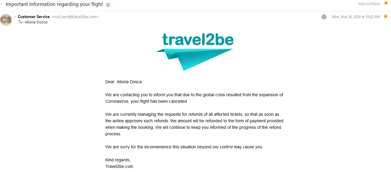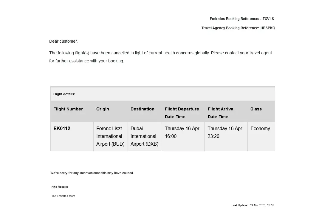 22nd March 2020 - Because of Covid situation, my flight EK112 was cancelled by airline company, so I asked a refund from Travelgenio.