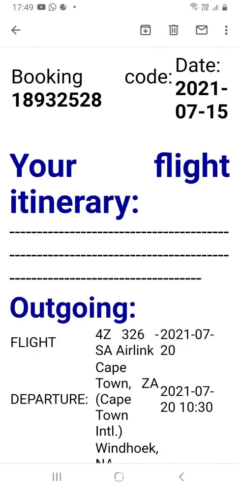 Cancelled Flight EK 0338, booking reference number SG7NFF