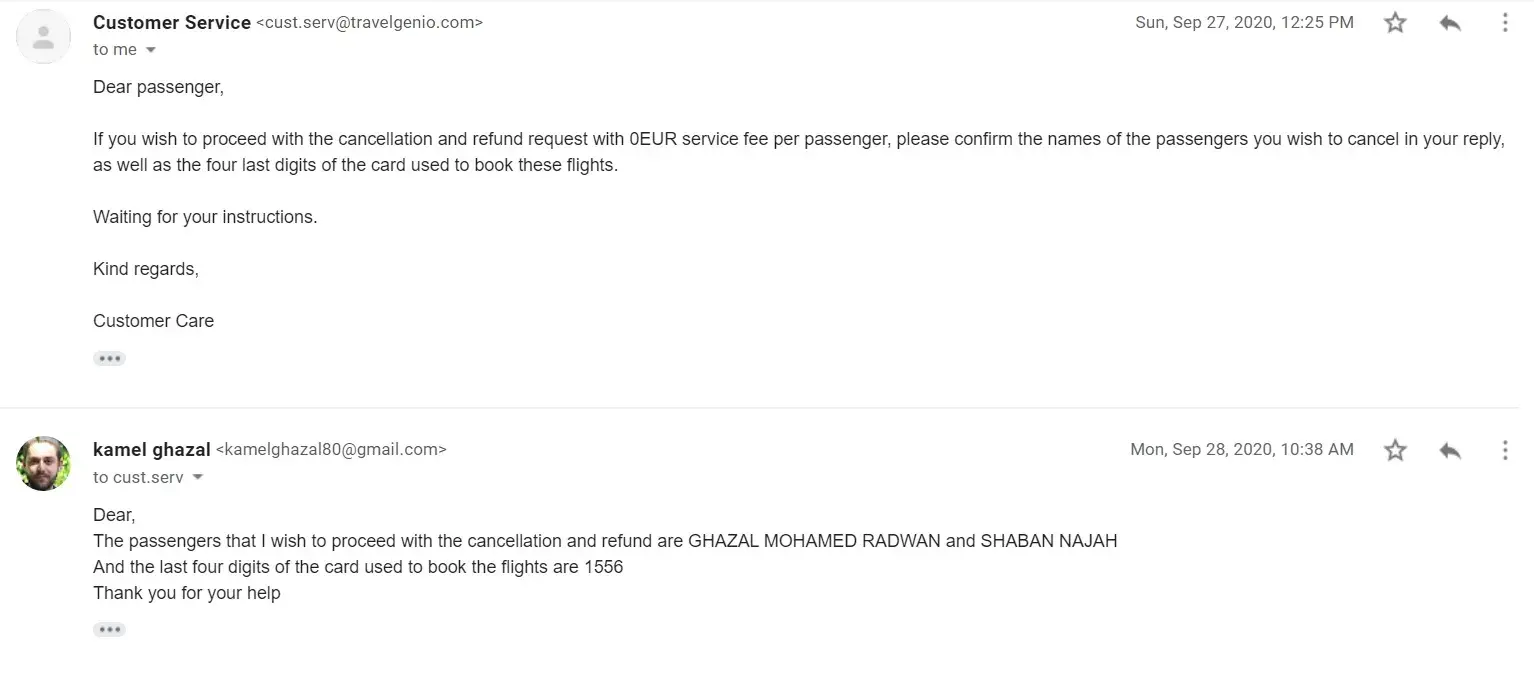 I send an E-mail to Travelgenio to refund the return flight amount in September 2020, they replied to my mail saying that the request for reimbursement of my tickets has been made and when the airline will give its consent they will refund the amount and The process will take from 60 to 90 days.
