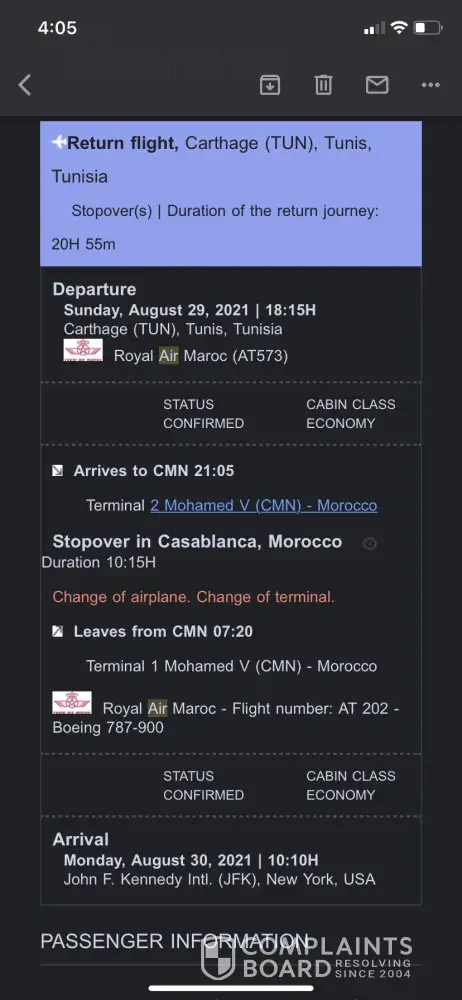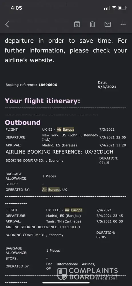 On May 5th, 2021, I bought a round-trip ticket from New York to Tunis. They sent me an Email with all the information that shows the details of my flight, from having a lay-over in Madrid and then from Madrid to Tunis. However, I called them yesterday June 12th to clarify the baggage details and everything. They told me that they don't have a flight from Madrid to Tunis and that the only option for me is a refund that I would receive in 3 months. This didn't make any sense to me since I was supposed to leave on July 3rd. I'm a student going to visit my family and that was the only money I have. Even when I look for a ticket now the prices are very high since the date is near. The representative was very rude to me and told me that they can't help in any way and that they don't really care. Please help me out with this I attached the Email that I received from them. Thank you!
