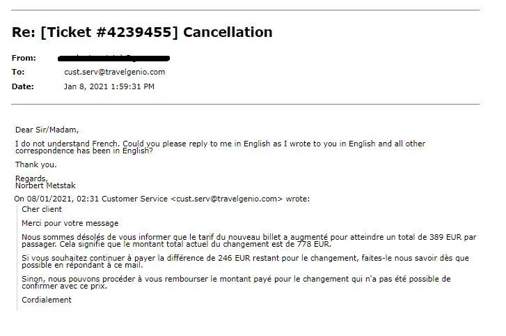 They first responded to me in French, although all previous communication has been in English. When I asked for a legible response in English, they sent me an email which was confusing, did not clarify my situation and frankly had very little to nothing to do with my request. After I replied explaining my situation in great detail and asking for clarification, they sent the very same response to me again (the one that was irrelevant and made no sense). I have attached screenshots of the emails (my personal email blacked out for privacy purposes; I can also forward them or send them as .pdf).