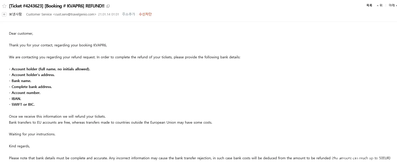 Since July 18, 2020, I have exchanged e-mails with Travelgenio several times, but there is still no refund, and there is no answer as to when to give the refund.