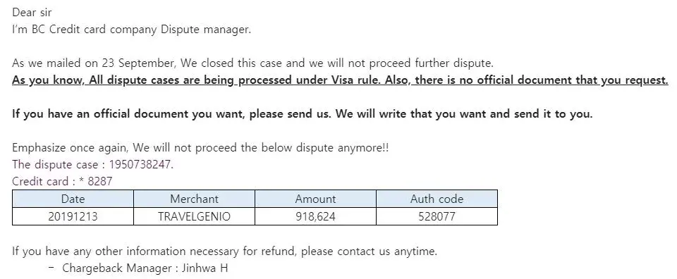 So I cancelled it. But I haven't received a refund yet, because the credit card company did not have an official document, instead, I sent the screen capture of the internet page that confirms the conclusion of the dispute. But Travelgenio insists on sending them an official document with a bank stamp for the refund.