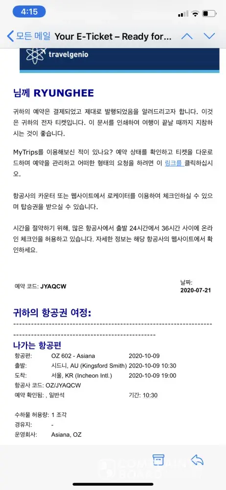 Hello, My name is Ryunghee Kim. I booked a flight on October 9th in September. Through the ‘Travelgenio Company. My ticket Reservation number is [protected] (JYAQCW), flight : OZ602. Asiana airplane, 10/9 SYD->ICN.