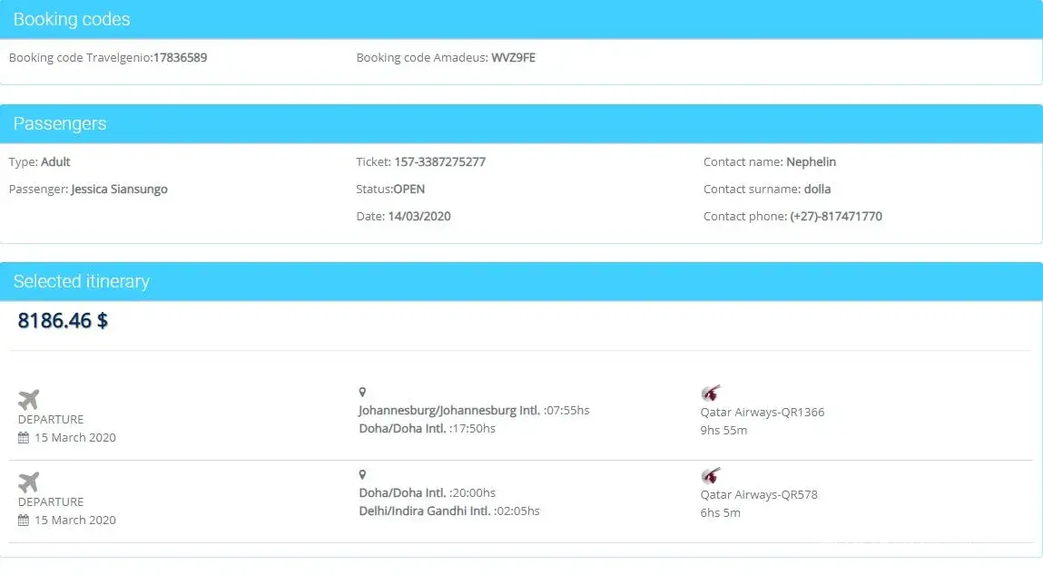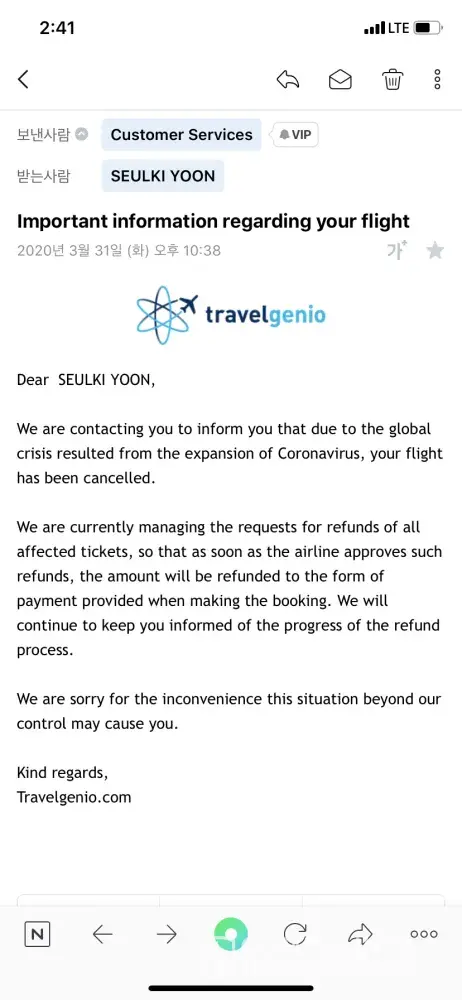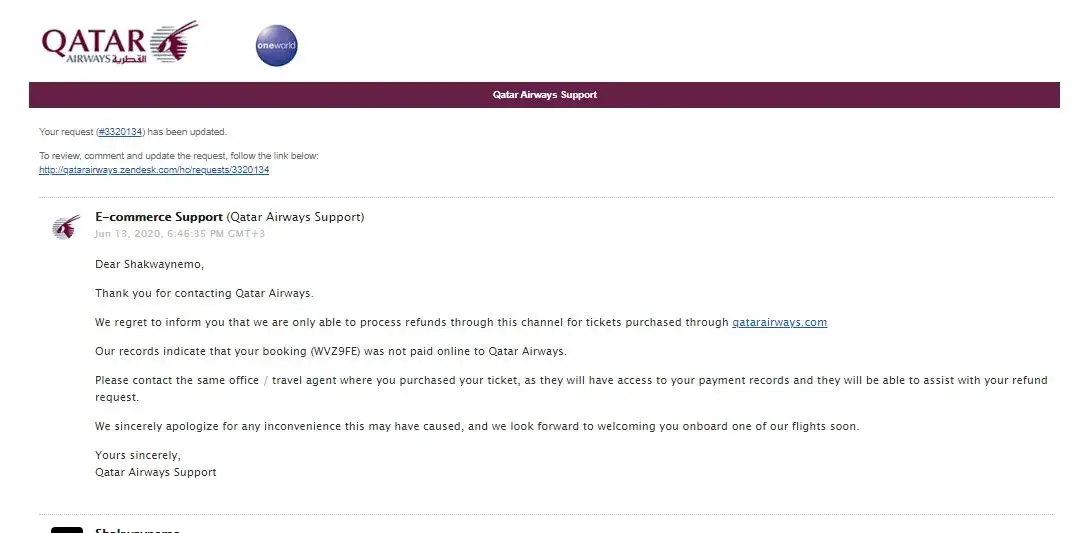 I made a reservation through Travelgenio. However, I heard that it could be refunded due to the COVID-19, and consequently the flight schedule has been canceled. I tried to get in touch you by e-mail, but you never respond. Again, My flight information is as follows; TICKET: 157-[protected] Reservation code: W2PN4Z departure date & time: (Incheon Intl.) [protected]:25 * QR 859 return flight information: QA (Doha Intl.) [protected]:25 * QR 328 I regret to inform you that due to the current pandemic, I have no choice but to cancel my booking. I tried to reach you several times, but you never answered. Please let me know when I can get refund or the scheduled date for refund. As I told you, I e-mailed you several times, so it would be better for you to try to look for the e-mails that I have sent. I want you to reply at your earliest convenience.