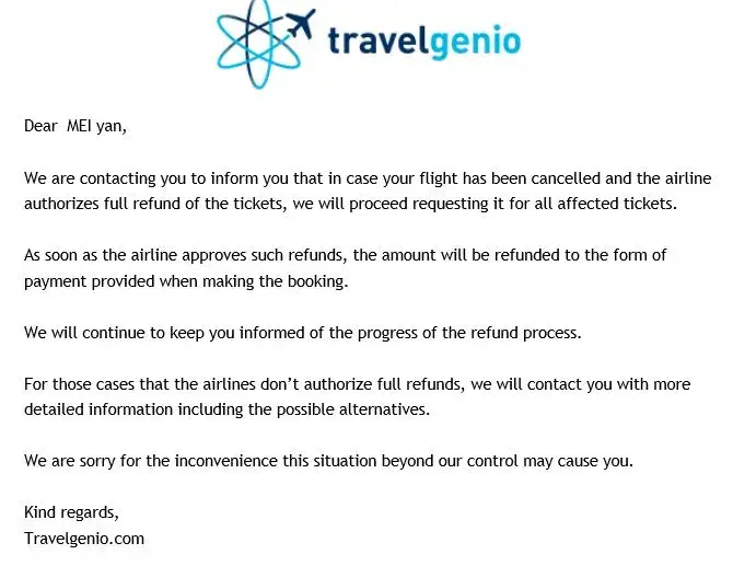 I am fully understand on my flight cancellation due to COVIS19. I was informed from Travelgenio that my flight cancelled due to COVI19 around beginning of March, 2020.