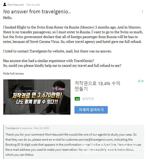 There is no reply even if I send you an email. How long do I have to wait? I'm posting on every review site. But you don't answer the phone. I want to get a refund but you guys don't work. I just want to cancel my flight ticket and get a refund. I also bought the insurance you sell. According to the insurance policy, you should give me a quick answer and refund. How long do I have to wait? If you do not answer my request for a long time, I will file a complaint through the International Dispute Review Board.