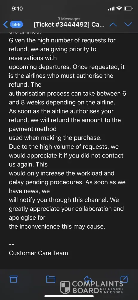 Our flights were supposed to be 3 months ago and I have been emailing and calling both travelgenio and the airlines. Each is passing the responsibility to the other and in the last email over a month and a half ago the email from travelgenios customer service asked me not to contact them again as they are busy and they will just message me. 3 months, no flights, no refunds. I have been more than understanding due to the Covid-19 but this is ridiculous, we are entitled to a refund by law if we cannot travel due to the world pandemic. When this is over and it will be, I highly doubt many people will use travelgenio for booking anything else. It's disappointing and embarrassing that everyone has to chase for their own money back on a service they have not received.