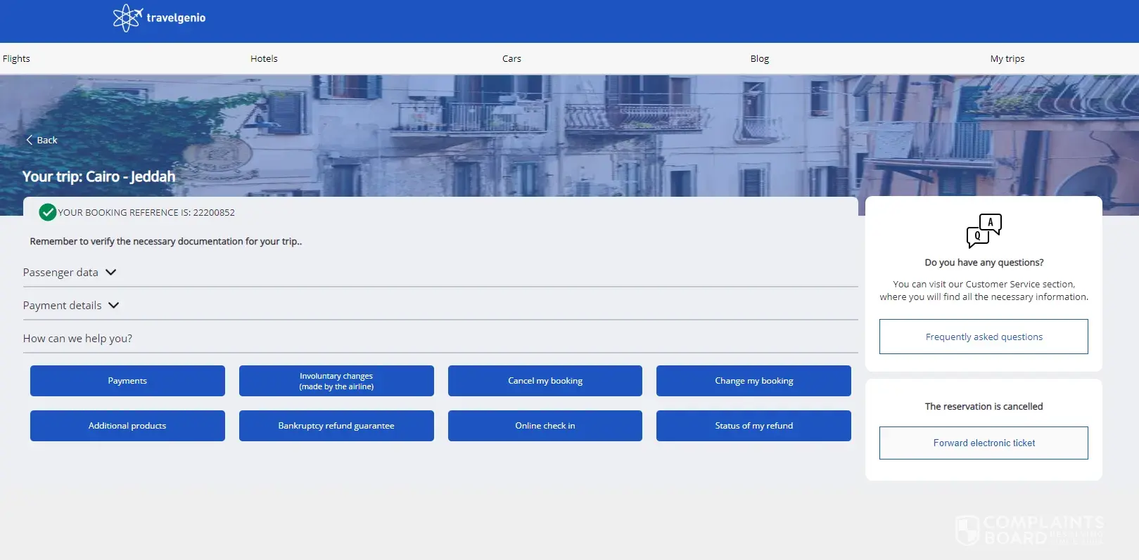 Attached is the email from Emirates showing that Travelgenio did not cancel my previous booking when changing the new flight.