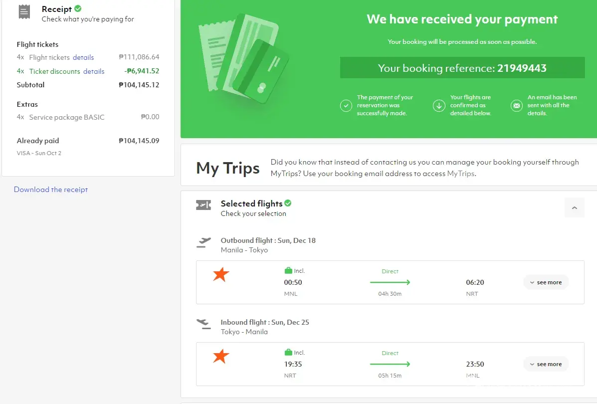 When I booked my tickets for the flight the travelgenio suddenly canceled it and when I saw my refund status it said it was fully refunded but it was never reflected in my bank account. I bought the tickets on Oct 2, 2022. My booking reference is [protected]. We booked a round trip from manila going to japan for 4 people and I never received a full refund in my bank account.