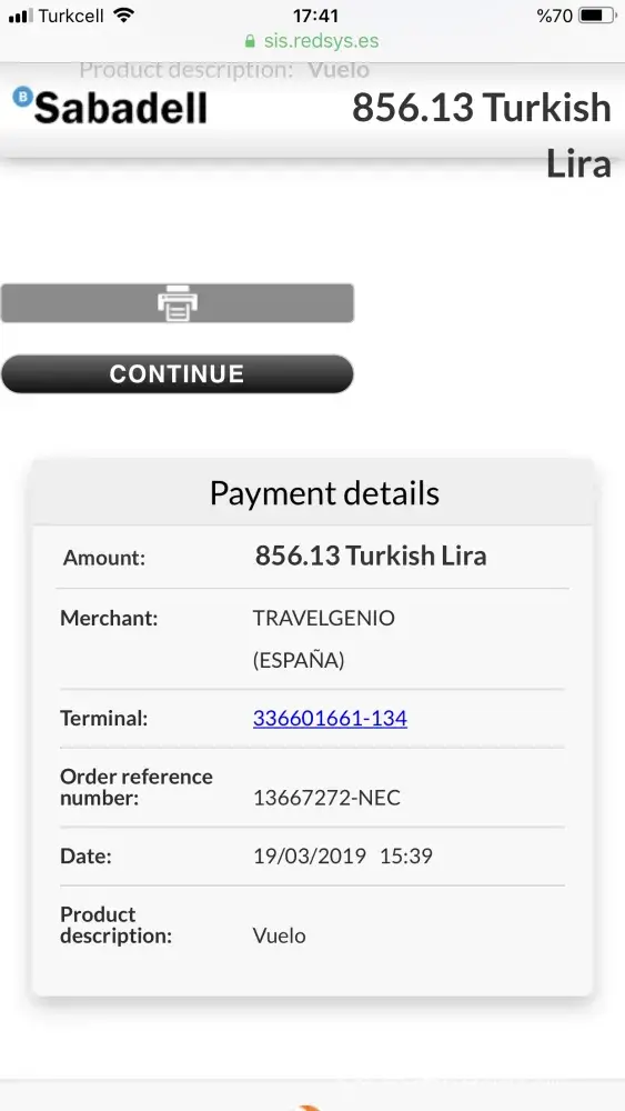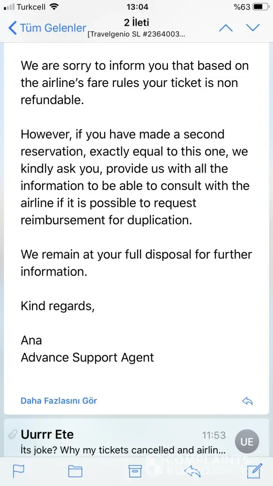 while I complete my ticket from travelgenio web page, it did not send 3D security number and wait almost 10 minute to complete but Travelgenio web page did not said ''you completed'' and travelgenio page didn't send me any e-mail during to one hour. Therefore I bought same ticket from other web page(ucuzabilet.com) and it's done clear. Travelgenio send me e-mail for ticket After that I called Airlines Company (Atlas Global) said to me same time and same person impossible to have reservation I asked for search their(travelgenio) ticket number from the airlines company and they said to me this is ''no such number'' and I called spain Travelgenio office told me okey we can cancel but you have to pay 30 euro for service. I suddenly called to solve the problem but they already bloked my ticket price on my bank acoount I realize that. it's like 2 time paid for ticket. one of them is real it's clear, otherone(travelgenio) took me fake number ticket.