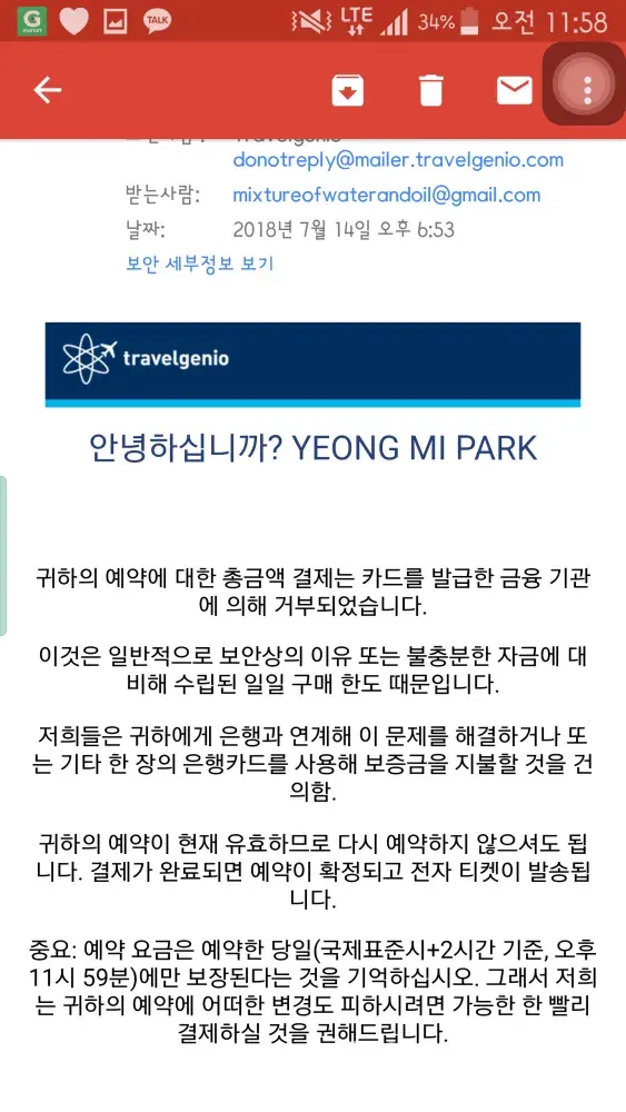 I got a mail that flight ticket from Korea to Frankfruit booked at 10:29 on 18th. Jul and credit card payment was made as well without my consent. so I immediately mailed that It is nothing to do with me and cancel it to your company. Also asked to block credit card to abroad too.
