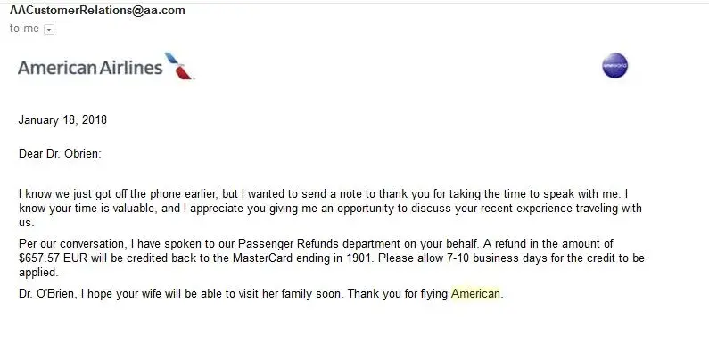 One of the attachments below shows the email from AA sending the money back to TravelGenio (Mastercard ending 1901) and the others show AA and myself contacting Travelgenio with the evidence.