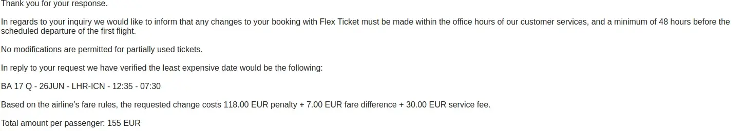 This is what I got as an email : "for In reply to your request we have verified the least expensive date would be the following: BA 17 Q - 26JUN - LHR-ICN - 12:35 - 07:30 Based on the airline's fare rules, the requested change costs 118.00 EUR penalty + 7.00 EUR fare difference + 30.00 EUR service fee. Total amount per passenger: 155 EUR".